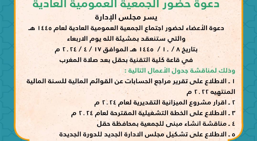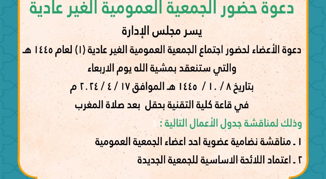 دعوه لجتماع الجمعية العمومية العادية وغير العادية بتاريخ 1445/10/8هـ